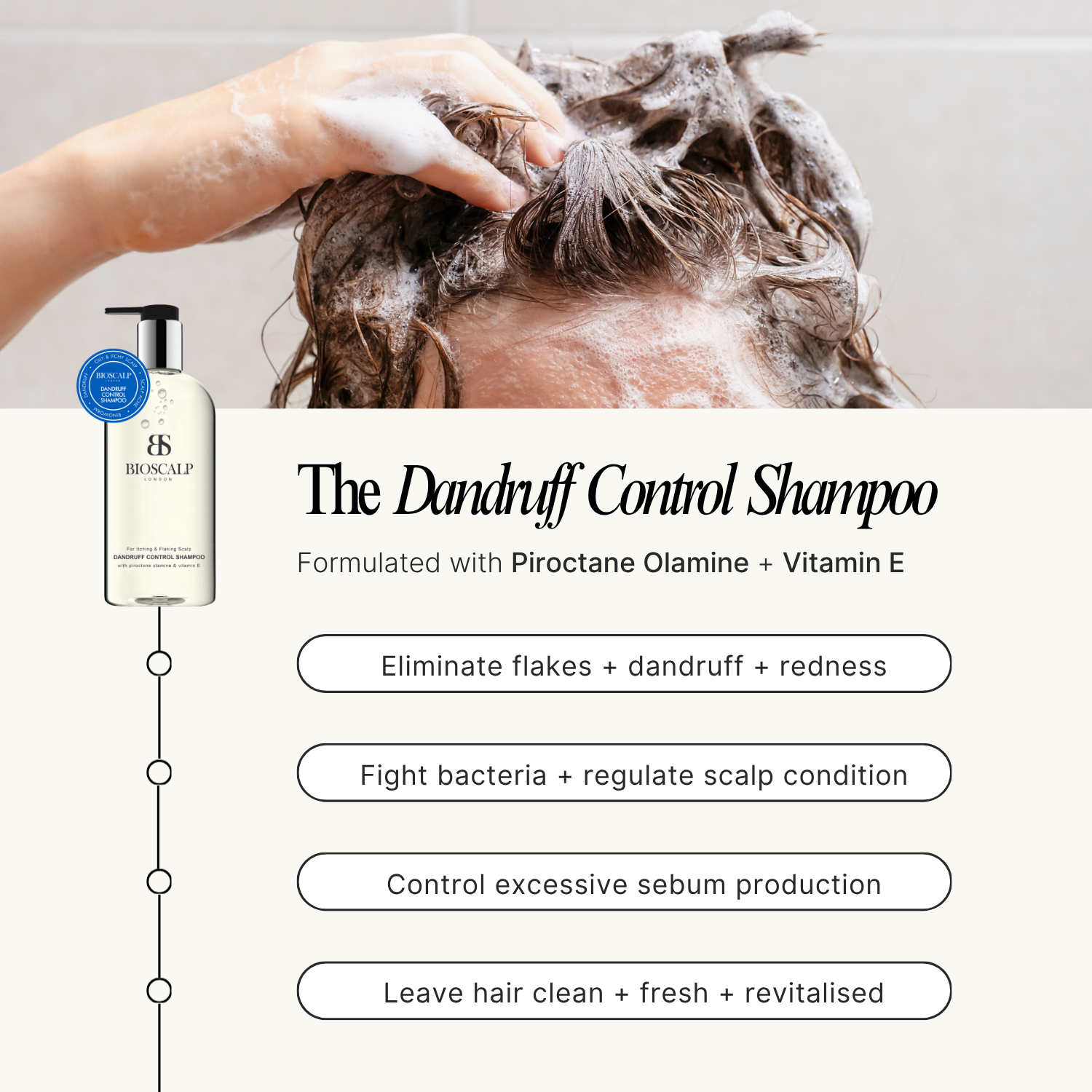 This kit combines three BioScalp essentials designed to work together to help control dandruff and calm an itchy, flaky scalp. Here’s how to use them, and where to top up each step when you run low: